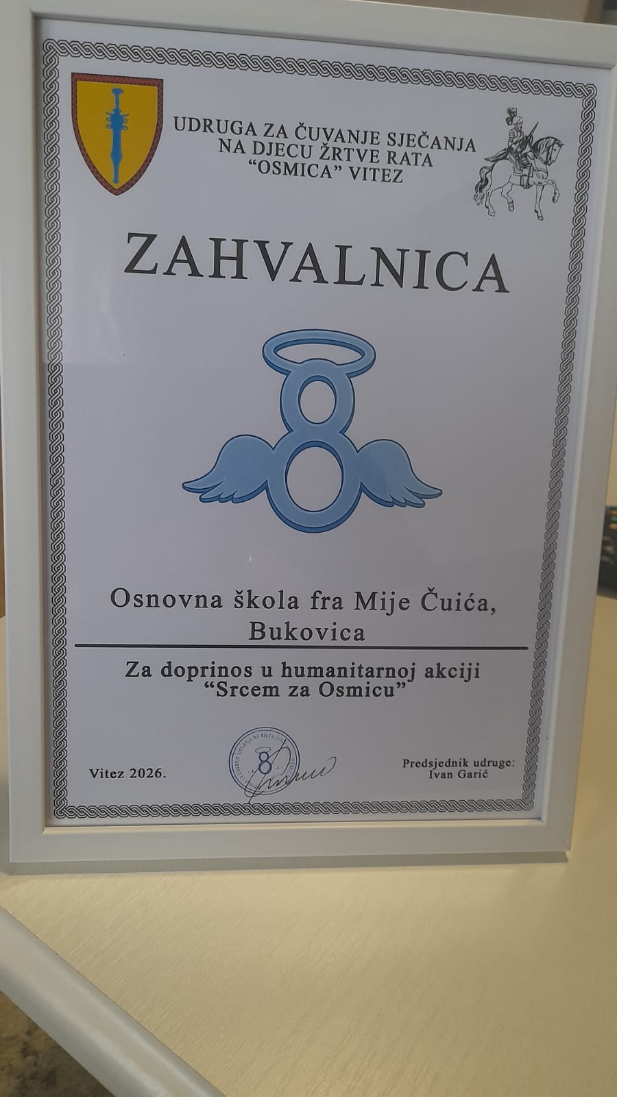 Hvalevrijedna akcija Srcem za Osmicu, provedena u duvanjskim osnovnim i srednjim školama, 25. ožujka 2026. dobila je svoj epilog. Predsjednik Udruge Osmica, gospodin Ivan Garić, uručio je svim sudionicima ove akcije prigodne zahvalnice, a iskrenu dobrodošlicu gostima iz Tomislavgrada na čelu s načelnikom Ivanom Buntićem, iskazao je i Boris Marjanović, načelnik Općine Vitez, Ivan Sajević, savjetnik ministra obrazovanja, znanosti, mladih, kulture i sporta KSB te predsjednik ogranka Matice hrvatske Vitez, gospodin Jakov Križanović.