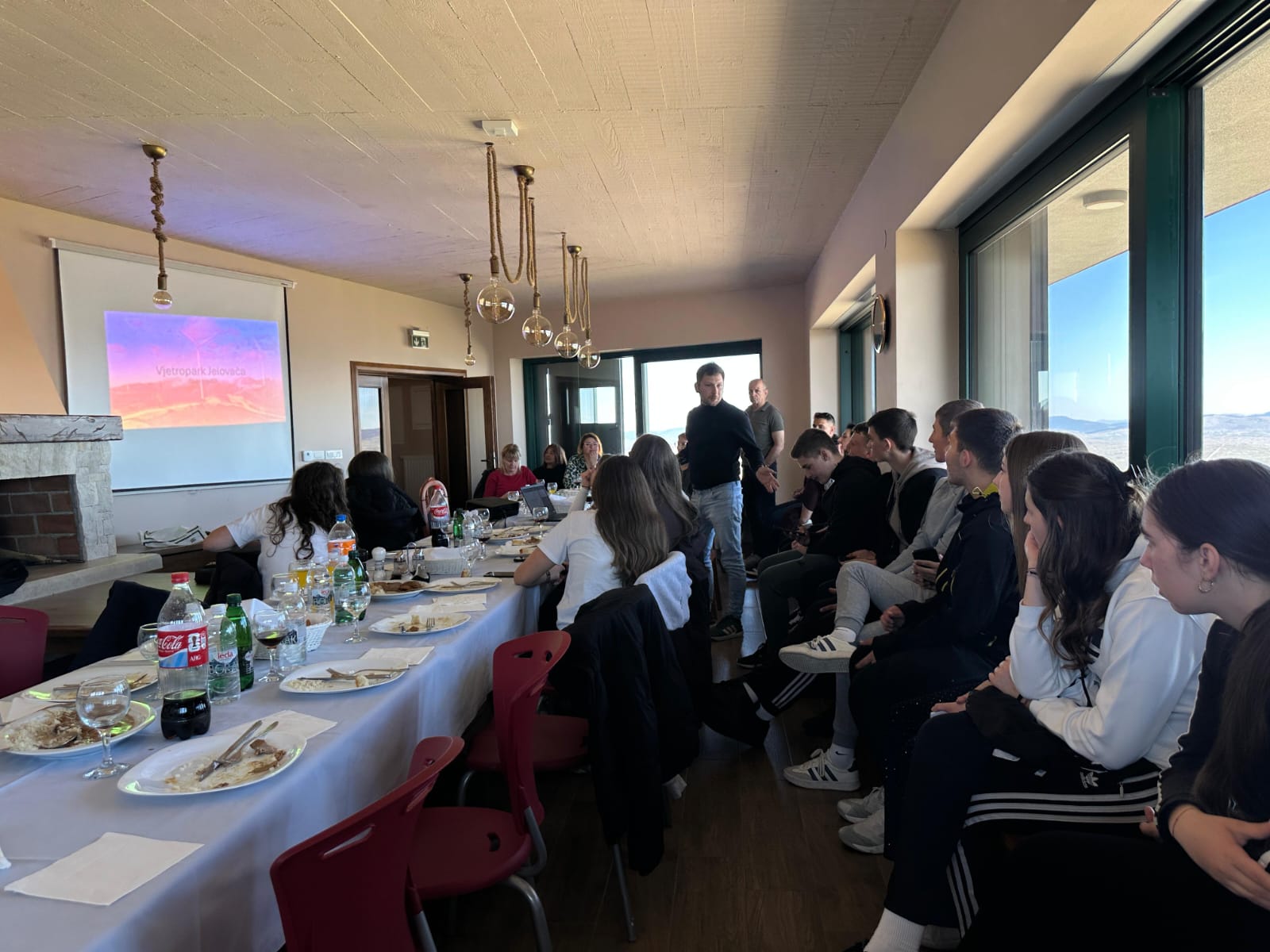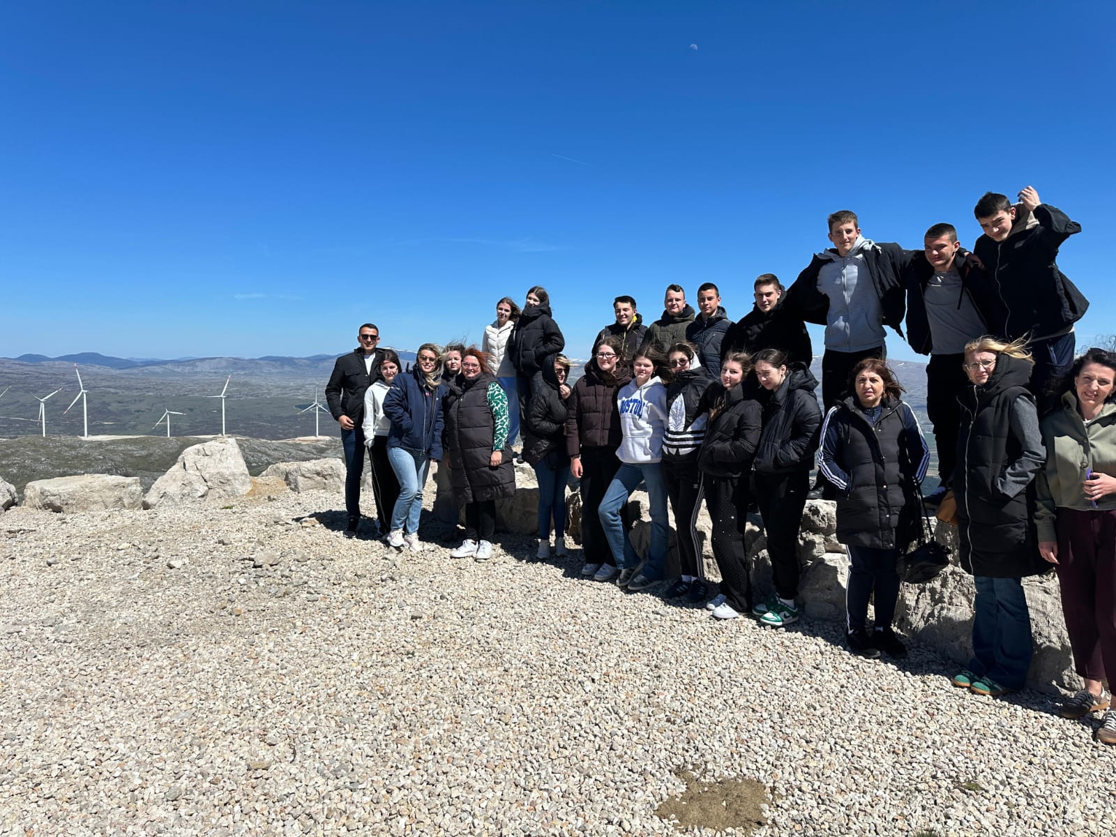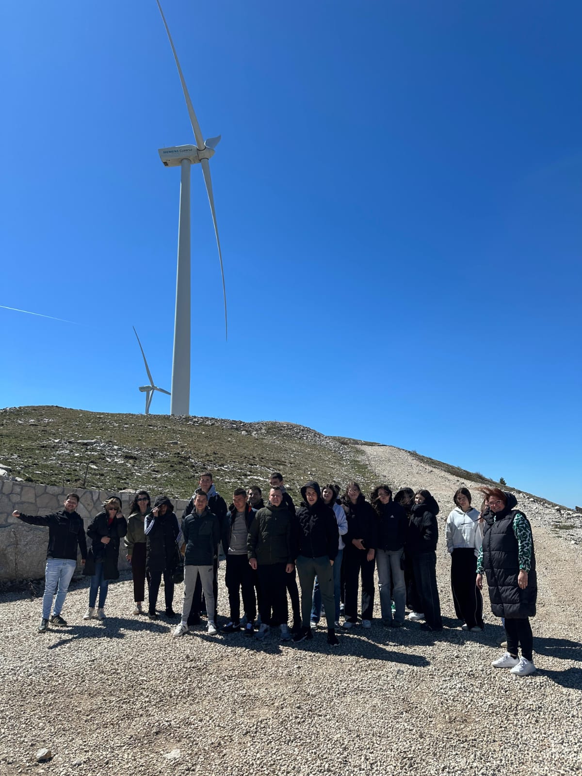 Posljednja stanica bila nam je Vjetropark Jelovača u vlasništvu Feala. Zahvaljujući Fealu mogli smo uživati u pogledu s Jelovače kojem nema kraja. Sve što su učenici učili iz geografije sad su vidjeli kao na dlanu. Feal nas je počastio ručkom na 1500m nadmorske visine i prigodnim darovima za sve učenike, a njihov inženjer je kroz prezentaciju, razgled i razgovor dao nama sve informacije o energiji vjetra i građi samog agregata. Tako su naši učenici uživo mogli dotaknuti lopatice vjetroagregata i sve ono o čemu su učili na nastavi tehničke kulture i iskusiti.