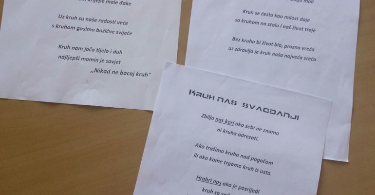 „Blago danu koji počne mirisima kruha“, lijepo je napisala Natali Šarić. Danas je u našoj školi bio lijep dan jer se posvuda širio miris kruha i kolača. Dani kruha uvijek donesu radost u školske prostorije jer sve zamiriše tradicijom i potakne zajedništvo. Nabrojati sve što naši učenici donesu, a njihove vrijedne mame i bake ispeku, skoro je nemoguće. Izložba tradicijskih i drugih od brašna napravljenih proizvoda natjecateljskoga je karaktera pa se učenici i dodatno potrude kako bi njihov stol bio najljepši. Duvanjski kraj oduvijek bijaše žitnica pa kruh rođen u Duvanjskom polju neodoljiva je okusa. Izložbu kruha i drugih različitih peciva, kao i plodova zemlje, možete pogledati na fotografijama iz svih naših područnih i središnje škole. Fotografije će sve zapisano zorno posvjedočiti.