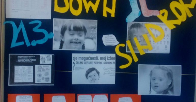 Svjetski dan osoba s Down sindromom obilježava se 21. ožujka kada bismo svi trebali obuti šarene čarape i tako pokazati svoje poštivanje i prihvaćanje osoba koje imaju jedan kromosom viška. Obilježavanje ovoga dana počelo 2006. godine u Singapuru kako bi se skrenula pozornost da osobe s Down sindromom imaju ista prava kao i drugi ljudi, odnosno da trebaju imati svoje mjesto u društvu kojem pripadaju. Znanstvena literatura bilježi kako se Down sindrom smatra jednim od najčešćih genetskih odstupanja što uzrokuje različite probleme u psihofizičkom razvoju djeteta. Upoznati dijete s Down sindromom znači upoznati iskonsku radost, ljubav i slobodu, odnosno dijete bez ograda koje stvara čovjek bez trisomijskoga poremećaja. Naš školski plakat prinos je obilježavanju Svjetskoga dana osoba s Down sindromom.