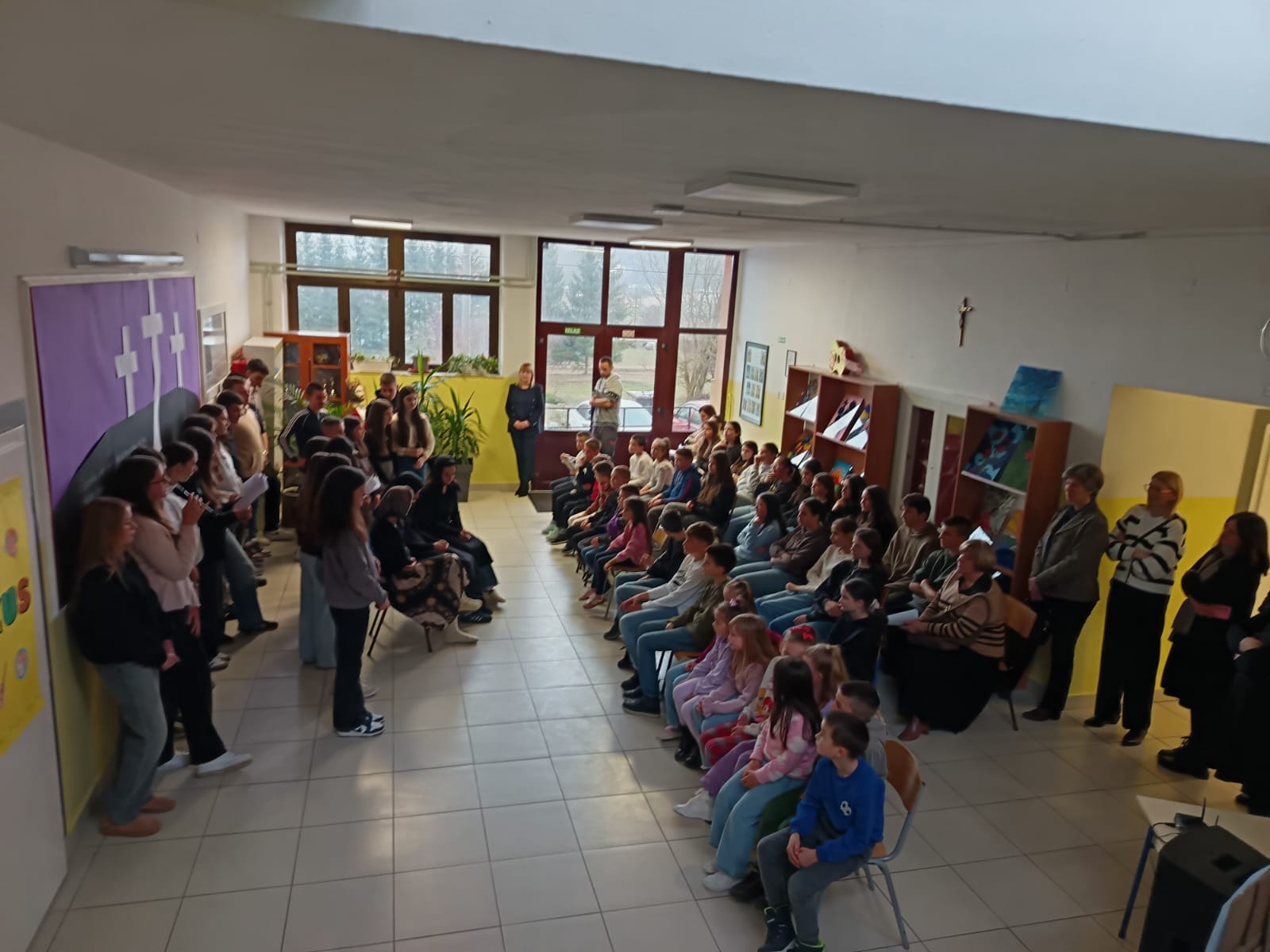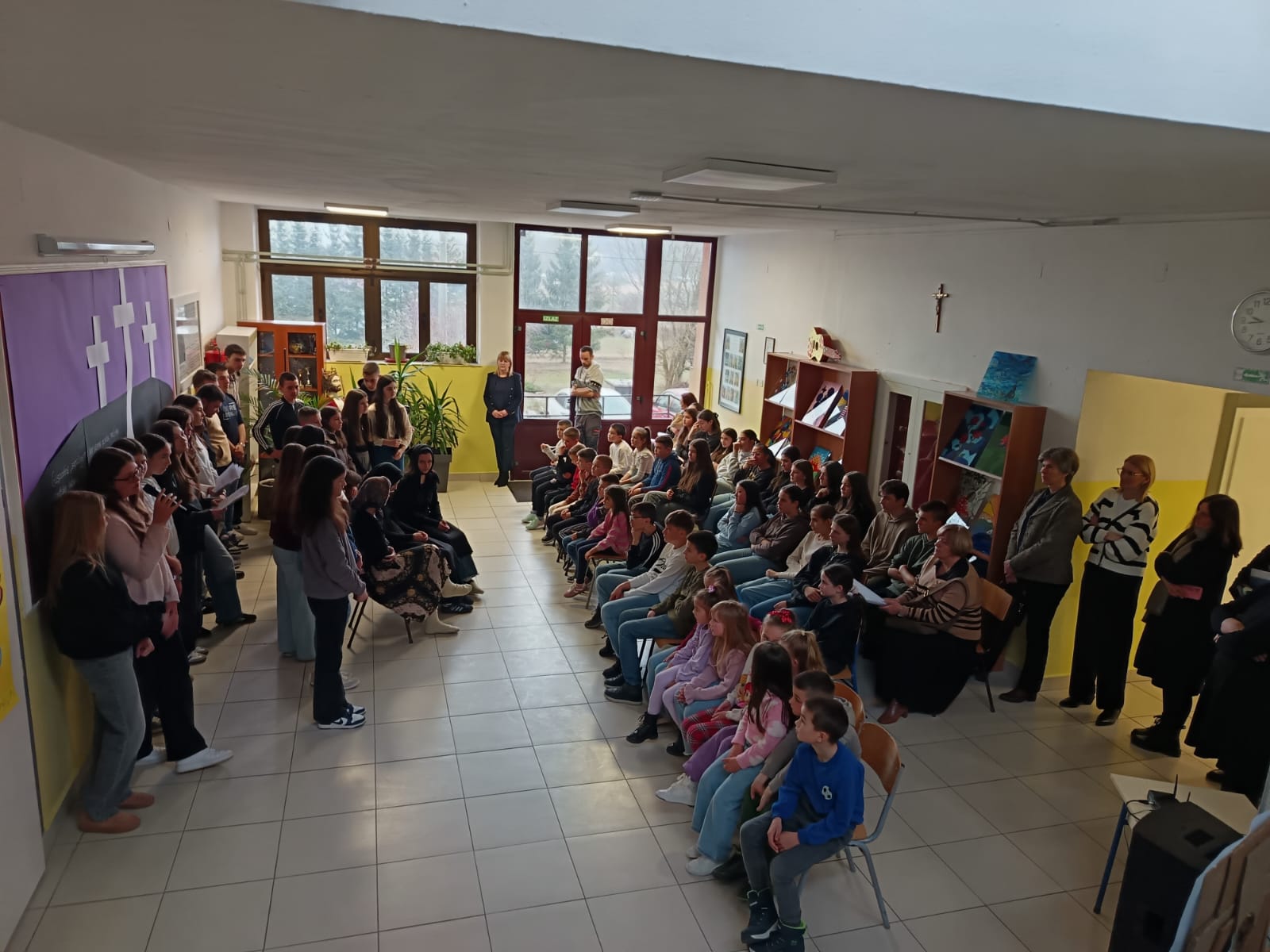 Danas, 17. ožujka 2026. učenici OŠ fra Mije Čuića su poetsko – scenskim programom obilježili Dan hrvatskog jezika.Kroz interpretativni govor poetske književne riječi ukazali su na ljepotu hrvatskog pjesništva te se predstavili i svojim učeničkim ostvarajima na temu hrvatskog jezika. Zaboravljene arhaizme uprizorili su u kratkom igrokazu „U prančioku“ pokazavši kako je zavičajni govor bitna odrednica našeg identiteta.Prezentirajući istraživački rad kroz Mjesec hrvatskog jezika, pokazali su svoje sposobnosti i vještine u govorenju, glumi te ukazali na potrebu njegovanja materinskog jezika i usvajanja standardnog. Na kraju se uz harmoniku i zapjevalo „ Vran planina, Ivo, razgovora nema“. Tako samo pjesma kaže, a svi znamo da je ispod ovih planina uvijek bilo razgovora, njemu hvala.